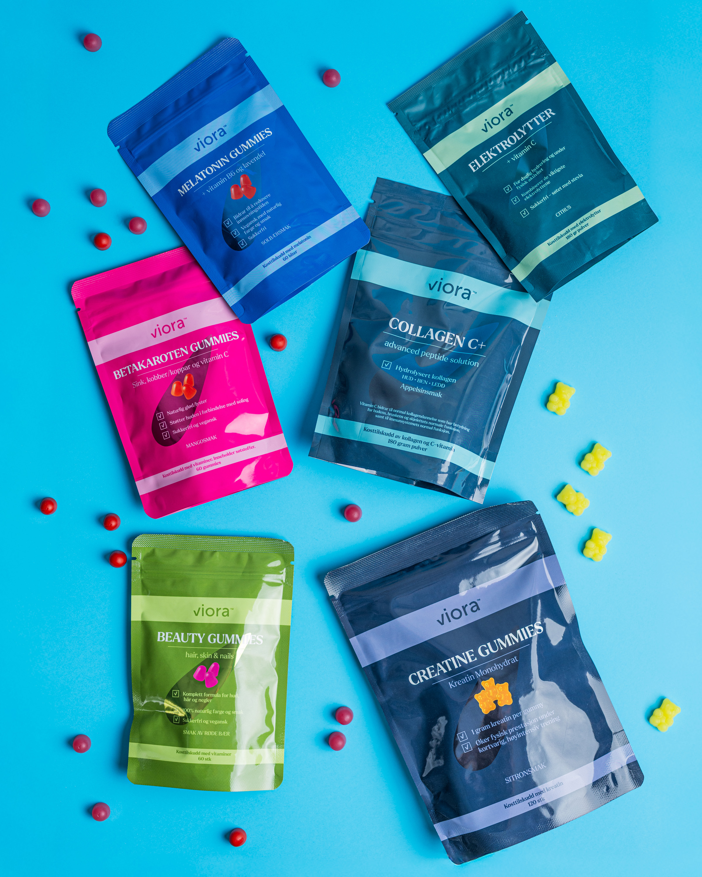 Viora™ Creatine gummies er et smakfullt, «ready to go» og praktisk alternativ – lett å ta med seg, ferdigdosert og full av smak.