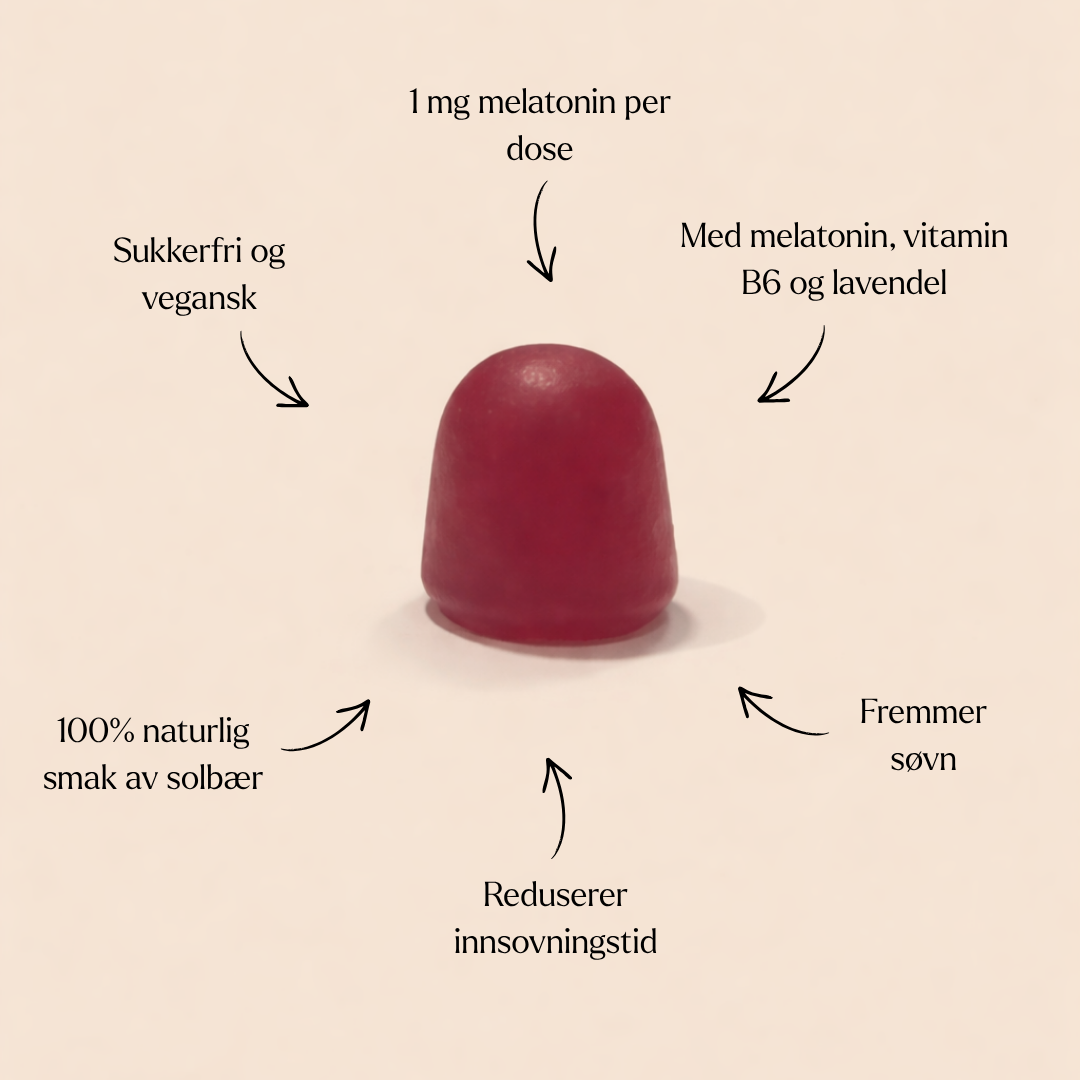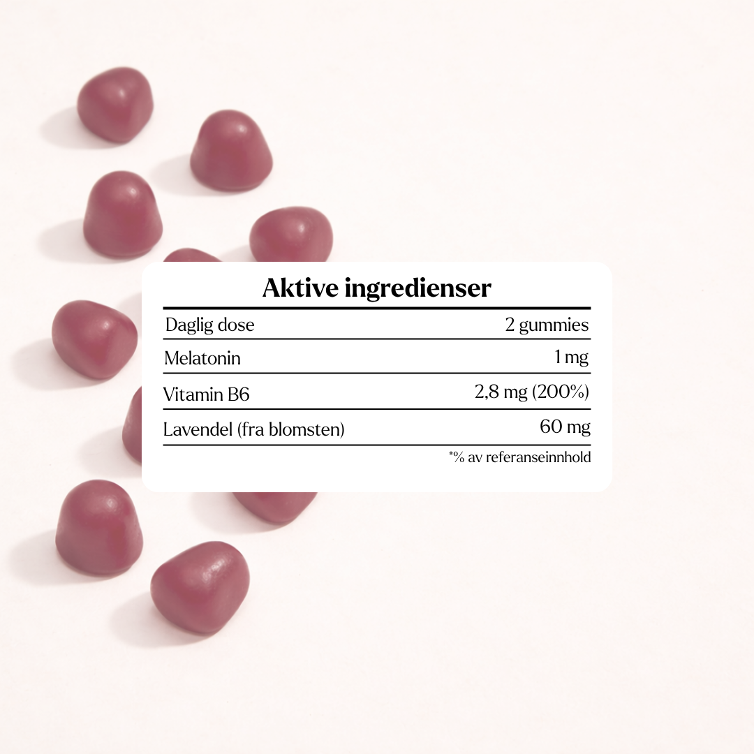 Melatonin, B6-vitamin og lavendel brukes ofte i kosttilskudd for å fremme søvn. Melatonin er et hormon som hjelper til med å regulere søvn og redusere tiden det tar å sovne. Vitamin B6 hjelper nervesystemets normale funksjon og kan redusere følelsen av utmattelse og tretthet. Lavendel er kjent for sine beroligende og avslappende effekter, som kan bidra til en roligere og mer behagelig søvn. Den gunstige effekten oppnås ved å innta 1 mg melatonin før sengetid.